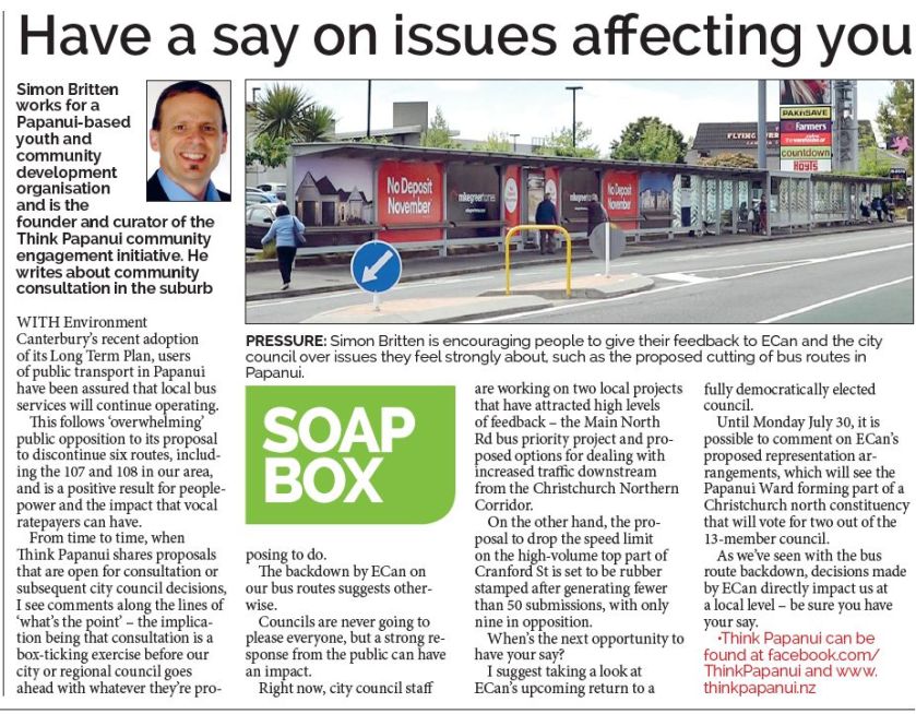 When’s the next opportunity to have your say? I suggest taking a look at ECan’s upcoming return to a fully democratically elected council. Until Monday July 30, it is possible to comment on ECan’s proposed representation arrangements, which will see the Papanui Ward forming part of a Christchurch north constituency that will vote for two out of the 13-member council. As we’ve seen with the bus route backdown, decisions made by ECan directly impact us at a local level – be sure you have your say.