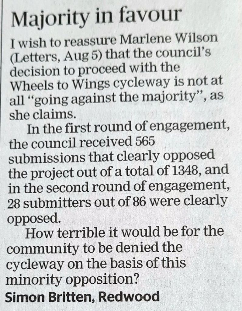 A subsequent response to me by another writer claimed that the Council’s decision was “going against the majority”. The actions by a vocal minority who oppose the project appear to have given some members of the public the impression that there is majority opposition. Not at all. Once again I pulled out my typewriter to bring clarity through a response. “…the Council’s decision to proceed with the Wheels to Wings Cycleway is not at all ‘going against the majority’, as she claims. In the first round of engagement, the Council received 565 submissions that clearly opposed the project out of a total of 1348, and in the second round of engagement 28 submitters out of 86 were clearly opposed. How terrible it would be for the community to be denied the cycleway on the basis of this minority opposition?”